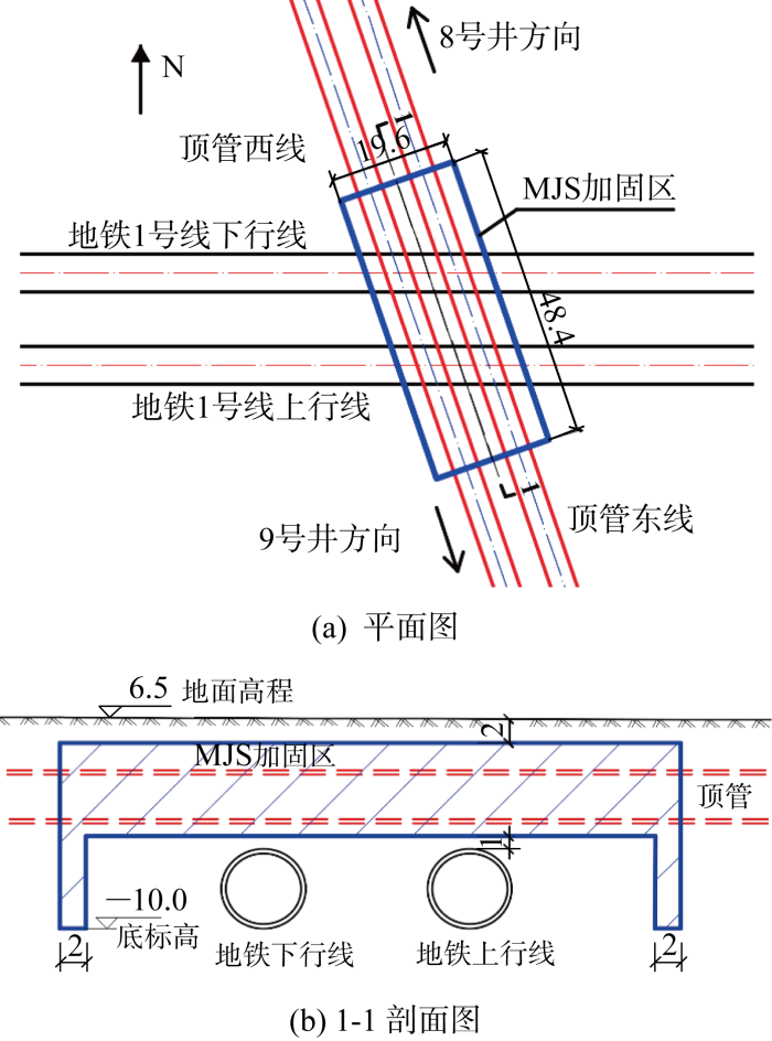 顶管上跨地铁盾构隧道与MJS工法桩加固区的平面图和剖面图(m)