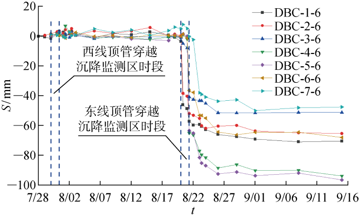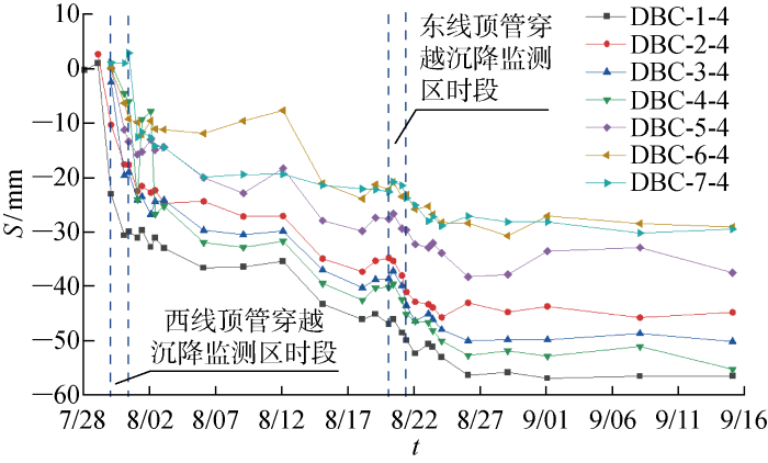 Transverse surface settlement of double-line pipe jacking in section DBC-1
