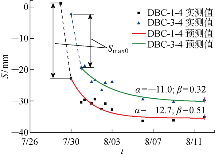 式中:Smax(t)为顶管穿越当前断面后轴线上方任意时刻t的地表竖向位移;Smax0为顶管穿越当前监测断面后t0时刻的瞬时竖向位移;α为反映最终竖向位移的参数;β为反映竖向位移发展快慢的无量纲参数.
