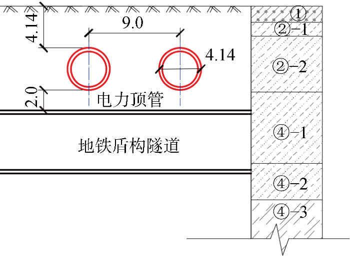 案例为城市高压线路上改下工程,里程总长度2 044.4 m,双线顶管长约285 m,埋深约4.14 m,管节内径3 500 mm,外径4 140 mm,壁厚320 mm,单节长度2.5 m,采用泥水平衡顶管机施工.顶管从北至南由8号井推至9号井,西线顶管先行施工.