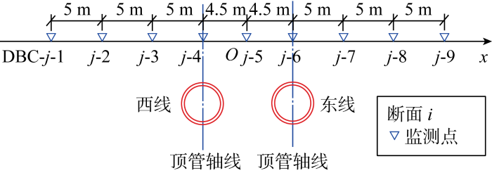 在图10中,可明显发现后行顶管对于先行顶管二次扰动的影响.在先行顶管穿越完成后,先行顶管轴线上方沉降发展若干天后保持稳定甚至有轻微的回弹,但自东线顶管开始顶进以后,先行顶管轴线上方沉降速率明显增大,在穿越完成后的若干天后沉降发展稳定且基本保持不变直至监测结束.