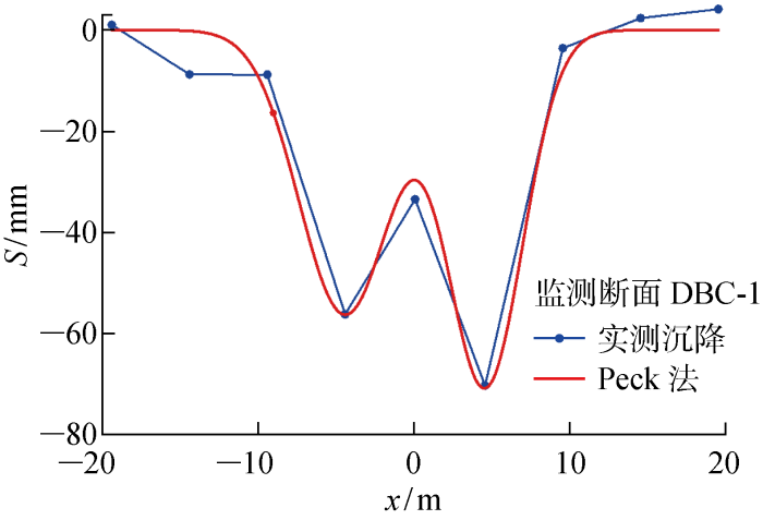 对于双线平行隧道的地面横向沉降预测,常采用将两条单线隧道地面沉降横向分布公式叠加的方法[7],并将重点放在先行、后行隧道的沉降槽宽度和土体损失率的选取上.