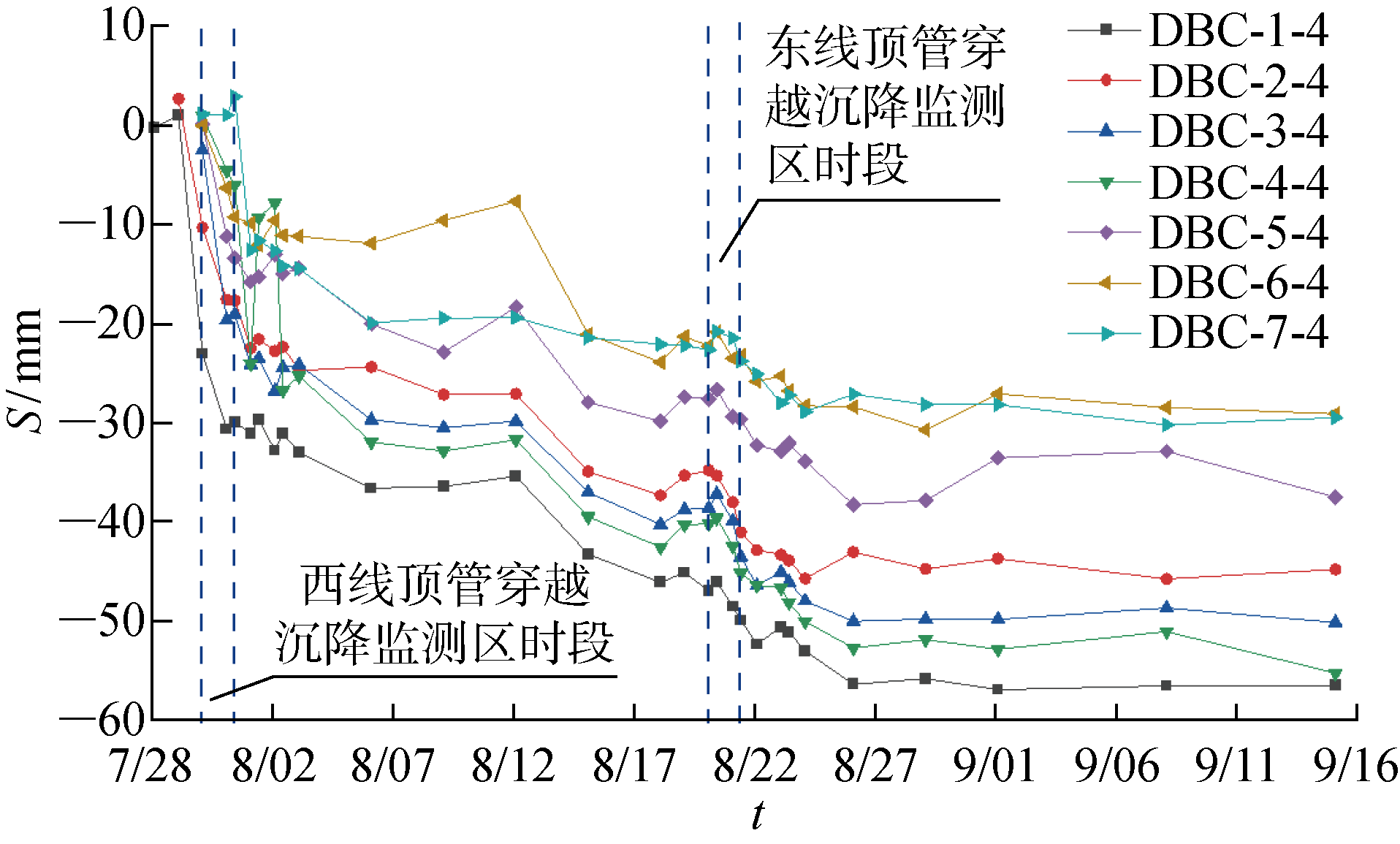 Fig.10 Time-dependent surface settlements above the pipe jacking of the western line |