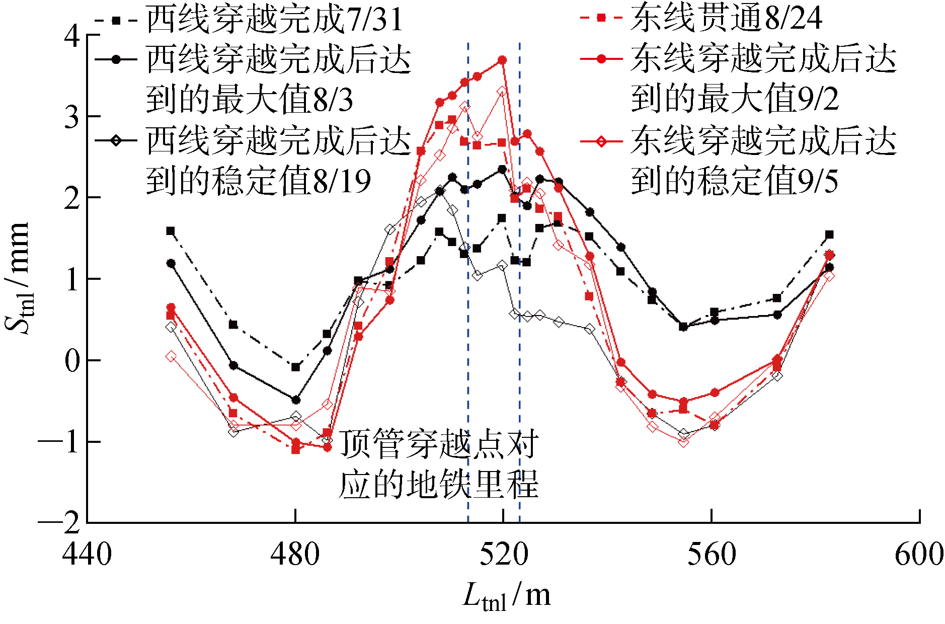 图7 顶管不同施工阶段地铁隧道纵向竖向位移 |