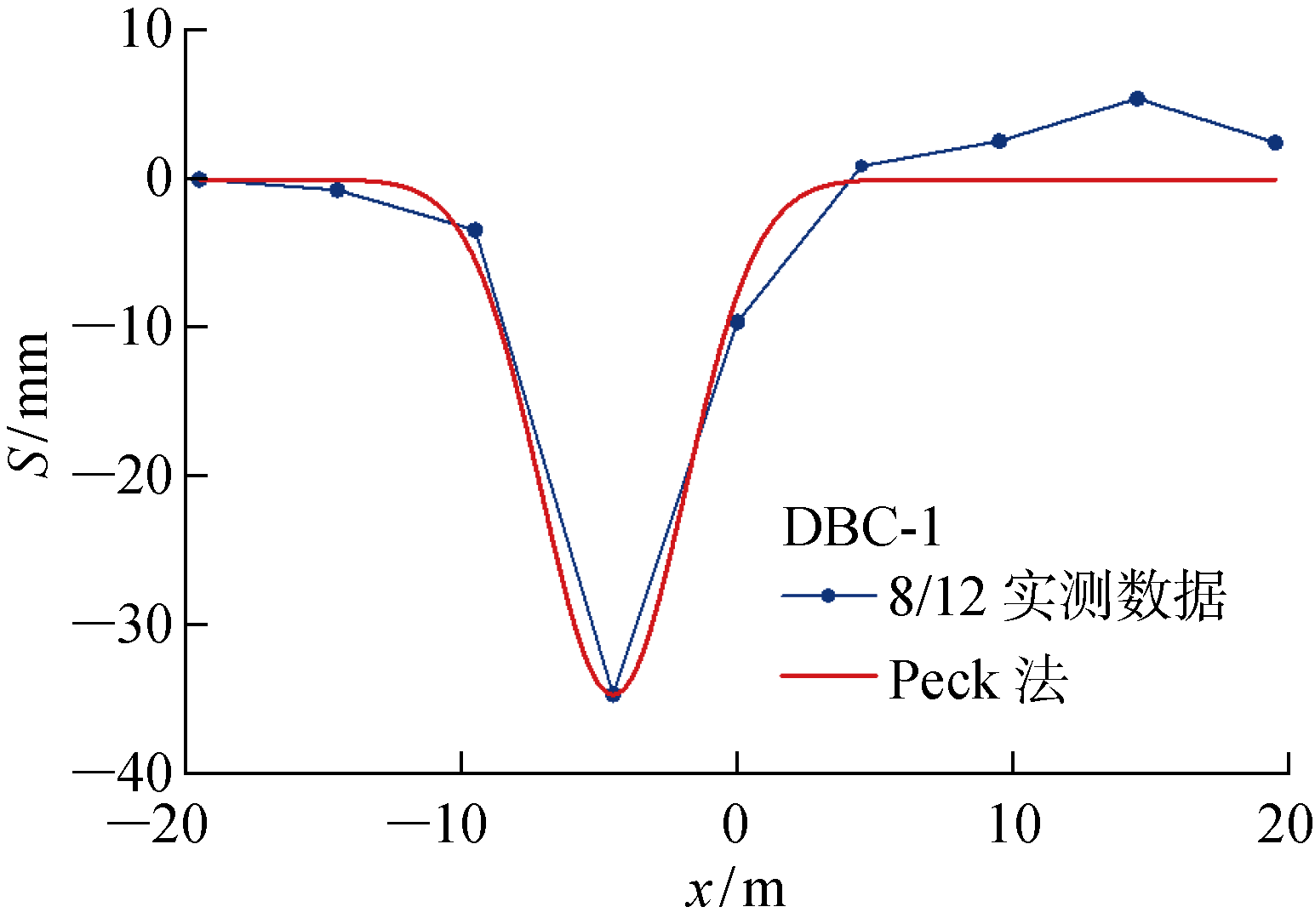 Fig.8 Transverse surface settlement of single-line pipe jacking in section DBC-1 |