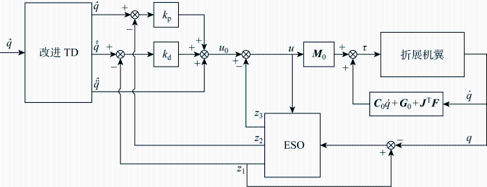 多体折展机翼的控制框图如图3 所示.图中:q ^ 为期望轨迹;k p 、k d 分别为比例系数和微分系数;u 0 为初步生成的控制信号;u 为经过扰动补偿后的控制信号;z 1 ~z 3 为ESO的状态变量.