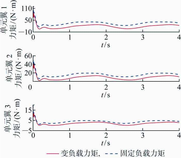 在考虑单元翼受到的气动负载和重力项随机体姿态角的偏置的条件下,通过拉格朗日方程推导建立了多体折展机翼的动力学模型.动力学方程的形式体现系统是一个具有强耦合和非线性的复杂系统,系统在运动过程中,各个关节相互影响[21 ] .基于拉格朗日方程得到的折展机翼动力学模型,建立起了单元翼关节驱动力矩与单元翼运动参数和机械参数之间的关系.
