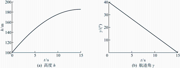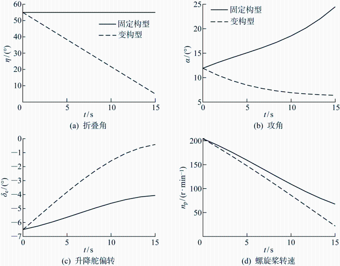 为验证变构型在爬升过程的飞行效率,给定爬升曲线如图10 所示,在折叠角η =55°的固定翼构型下,给定飞行器爬升飞行速度v =17 m/s.在变构型控制策略爬升中不再约束单元翼折叠角,飞行器在爬升过程中折叠角从55°收拢变化至5°展平状态.