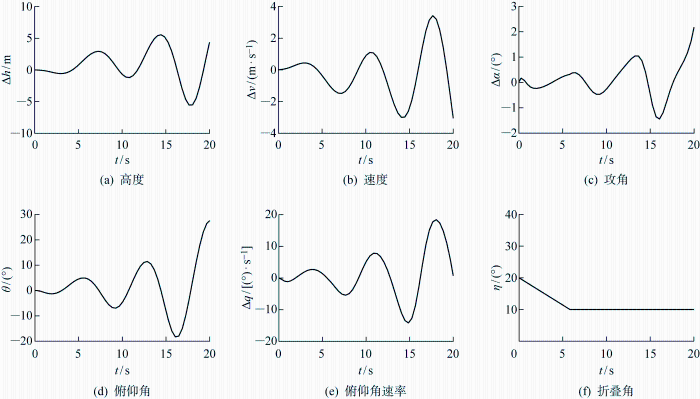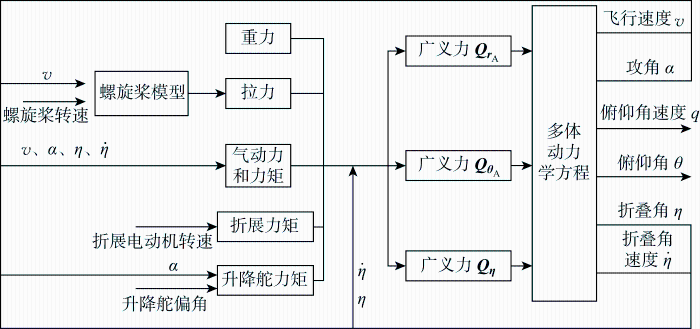 折叠翼多体动力学模型存在5个输入量,分别为3个折展力矩、升降舵偏角以及螺旋桨转速;输出量分别为飞行速度、全局攻角、俯仰角、俯仰角速度、折叠角和折叠角速度.多体动力学模型结构如图5 所示.