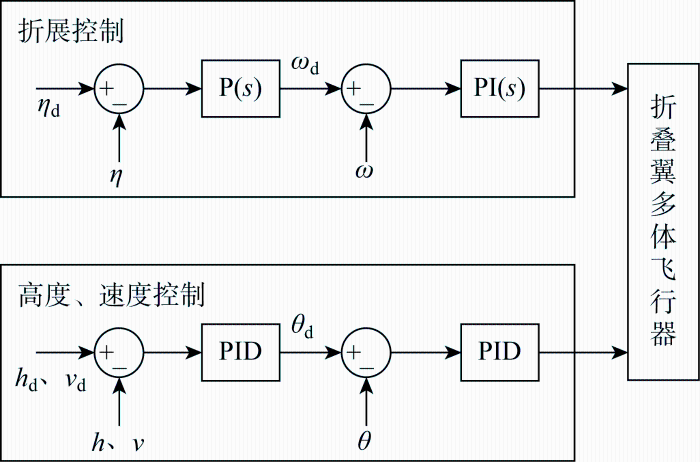 ... FWA的飞行动力学与传统的单架飞行器有所不同,但传统控制设计的基本原理依然可以使用,倾转过程中无人机的掉高问题需要考虑[28 ] ,整个飞行控制结构如图13 所示.采用串联式PID控制器,其中包括飞行器姿态高度控制器以及折展控制器,通过升降舵控制俯仰,螺旋桨控制飞行速度,折展机构控制折叠运动,其中P(s )为比例控制,PI(s )为比例积分控制,下标d表示预期指令. ...