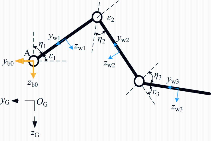 (4) $\left.\begin{array}{l}\boldsymbol{\omega}_{\mathrm{M}}=\boldsymbol{E}_{\mathrm{A}}^{\mathrm{M}} \boldsymbol{\omega}_{\mathrm{A}}+\left[\begin{array}{lll}\omega_{1} & 0 & 0\end{array}\right]^{\mathrm{T}} \\\boldsymbol{v}_{\mathrm{M}}=\boldsymbol{E}_{\mathrm{A}}^{\mathrm{M}} \boldsymbol{v}_{\mathrm{A}}+\boldsymbol{\omega}_{\mathrm{M}} \times \boldsymbol{r}_{\mathrm{AM}}^{\mathrm{M}}\end{array}\right\}$