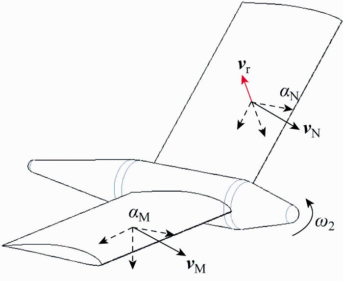 由于变形过程中各单元翼的速度和姿态均发生改变,单元翼局部攻角αw 因受折展运动而引起的附加相对速度v r 的影响,以单元翼M和N间的相对运动为例,如图4 所示.因此,在运动学建模中需要计算每个单元翼上的局部速度和局部攻角,各单元翼在局部体坐标系下的角速度和速度可以表示为