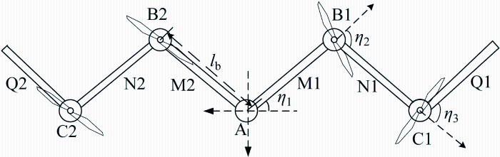 本文设计的FWA由5段机舱和6段单元翼串联组成,如图1 所示.图中:FWA左右两侧始终保持对称,中心机舱命名为A,由中心向外侧依次连接着单元翼M、N、Q和副舱B、C,其中左侧命名为M1,右侧命名为M2,以此类推.A的质心点相对于地面的飞行速度为v ,并称此处攻角为全局攻角α. 各单元翼分别受到气动力Lw 、Dw ,其中w 表示单元翼M、N、Q.4个机舱中各布置一旋翼,机舱受到螺旋桨推力Tb ,其中b 表示机舱B、C.单元翼M、N、Q分别受到安置于机舱A、B、C中的折展机构提供的折展力矩τi ,驱动单元翼绕机舱纵轴折展运动,其中 i =1,2,3,后侧安装有升降舵以提高纵向稳定性.与其他折叠翼飞行器相比,FWA单元翼的变形驱动机构由副翼变为折展机构,转向操纵可以通过非对称变形形成的向心力来实现,垂直起降阶段侧重于纵向机动,本文针对对称变形研究折叠翼的运动特性.