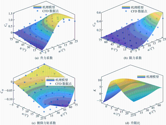 ... FWA的气动力和力矩如图8 所示,FWA的升力和阻力随着折叠角增大而减小,升阻比K 在小攻角范围内随着折叠角的增大而增大,在攻角α =6°时达到最大值.此外机翼收拢会使FWA产生正俯仰力矩,因此幅度过大的变形容易导致静不稳定.为了验证机理建模的准确性,利用Fluent软件获得FWA在集中式变形下的气动数据.假设变形响应足够快,变形产生的非定常气动力的影响可以忽略不计[26 ] ,计算流体力学软件CFD的计算验证了机理建模的合理性. ...