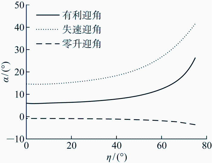 最大升力系数时的失速攻角随变形的变化如图9 所示,此边界为变形过程的迎角上限.随着折叠角增大,失速迎角会增大.不同折叠角下零升系数为迎角下限,超过此边界折叠翼的升力为负值.同时,也可以得到最大升阻比时的迎角随变形的有利迎角曲线,在小变形下有利迎角约为攻角上下限的中线位置,安全裕度较大.