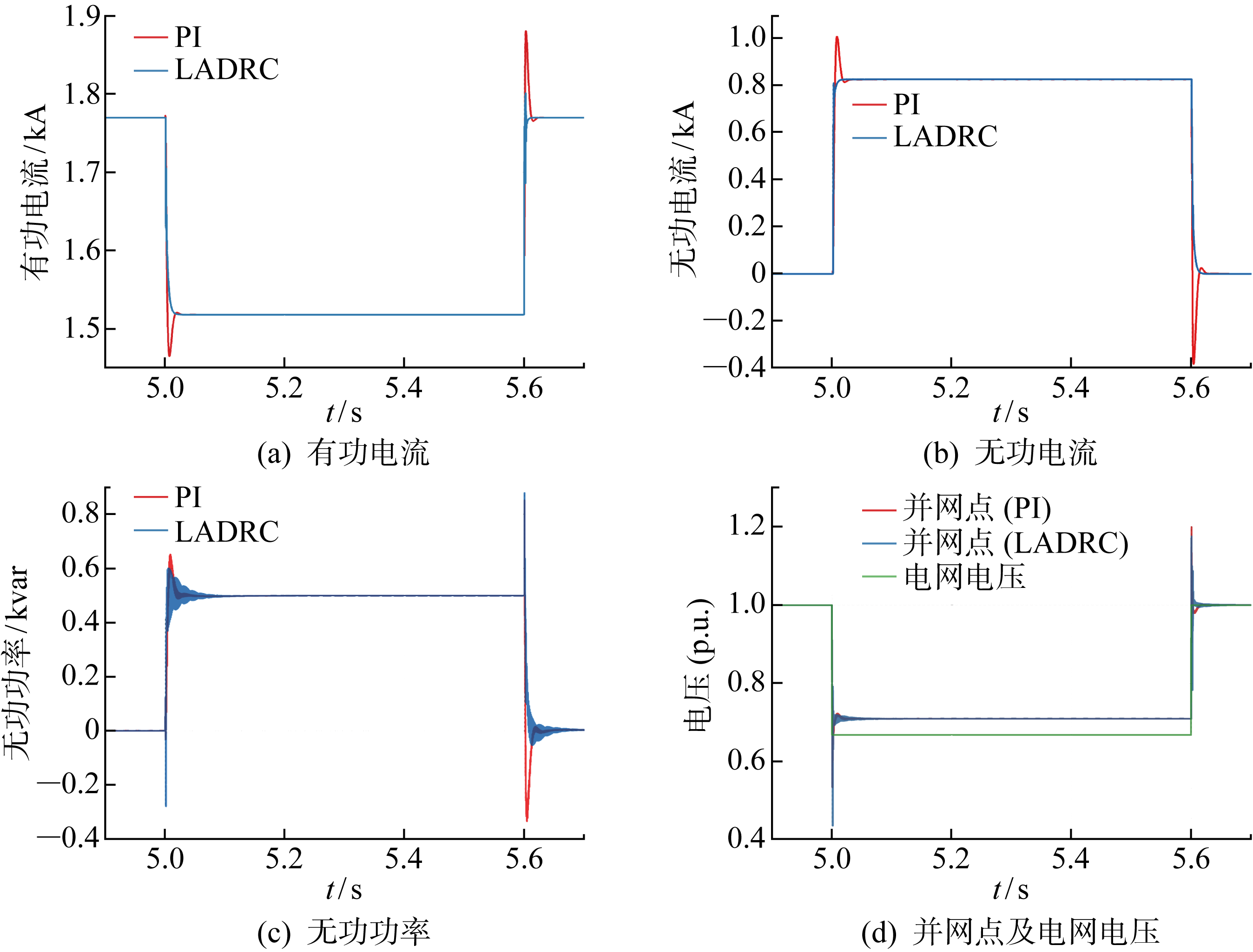 Fig.7 Simulation waveforms of PI and LADRC control strategies in grid symmetrical fault |