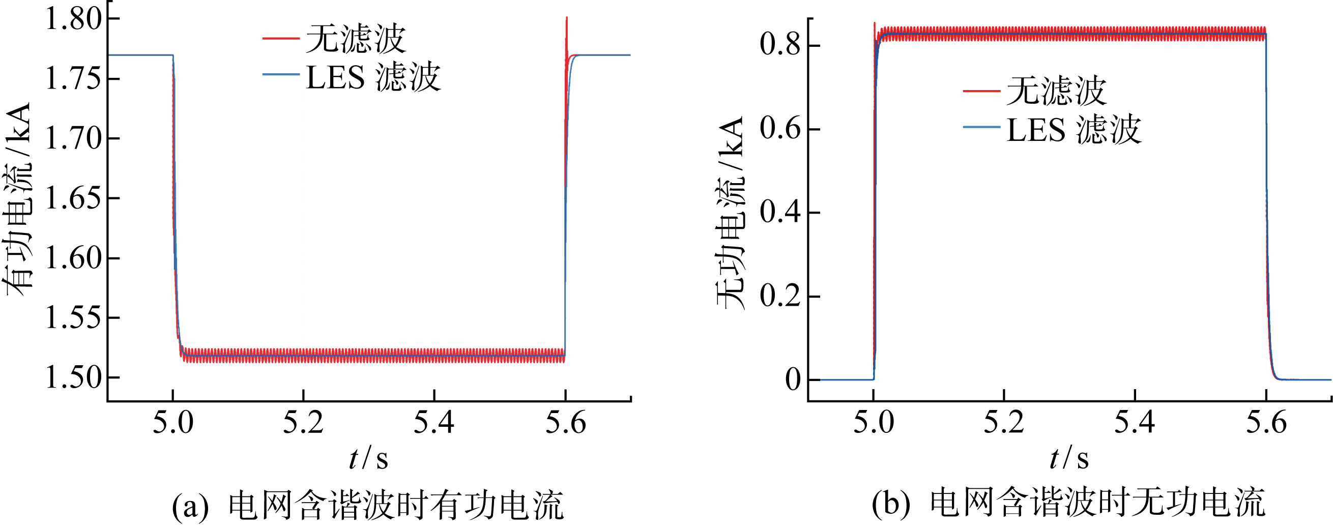 图9 电网含背景谐波时采用LES滤波前后的仿真波形 |