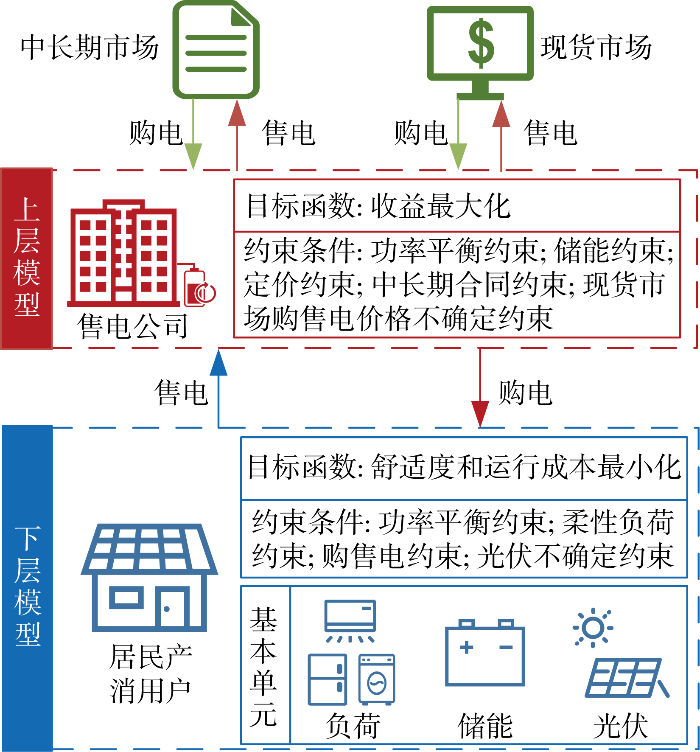 目前,国内外学者对售电公司的购售电策略进行了大量研究.文献[4 ]中基于双层规划理论和时间序列最优聚类建立售电公司购售电决策模型,并通过Karush-Kuhn-Tucker (KKT)条件将双层模型转化为单层线性模型;文献[5 ]中在文献[4 ]的基础上,提出一种考虑用户自主选择的零售电价定价策略,建立以售电公司利润最大化为目标的决策模型;文献[6 ]中采用演化博弈理论分析电力用户对多类零售电价的选择行为,提出了一种考虑有限理性用户选择行为的售电公司运行策略;文献[7 ]中采用主从博弈的方法对售电公司与多元用户的关系进行建模,以售电公司效益最大化、用户综合满意度最大化为目标,构建售电公司决策模型.上述文献虽然对售电公司的优化决策进行了广泛研究,但缺乏对用户侧售电情况的考虑.产消用户的出现使得售电公司在用户侧和上级电力市场的单向能量交互变为双向.售电公司的购电和售电电价将综合影响产消用户的用能优化情况,忽略售电电价将难以实现产消用户和售电公司双方的经济最优.