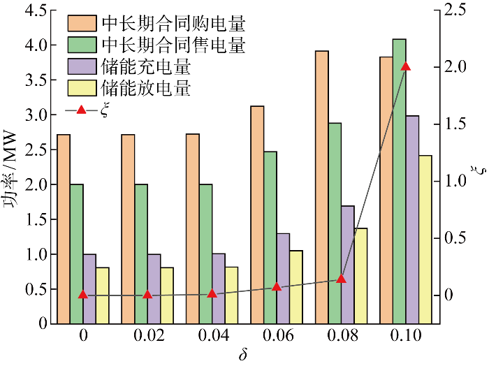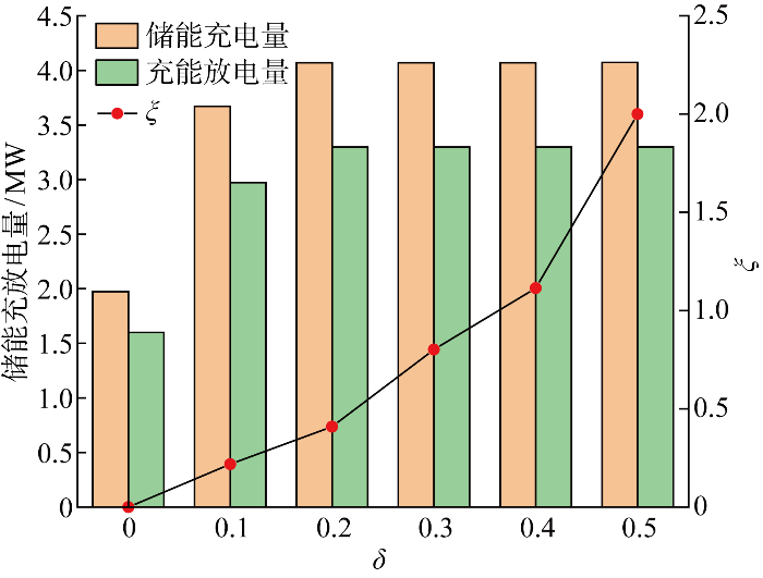 式中:${P}^{\mathrm{c}\mathrm{h}.\mathrm{m}\mathrm{a}\mathrm{x}}$ 、${P}^{\mathrm{d}\mathrm{i}\mathrm{s}.\mathrm{m}\mathrm{a}\mathrm{x}}$ 分别为产消用户储能所允许的最大充、放电功率;${P}^{\mathrm{c}\mathrm{h}}\left(t\right)$ 、${P}^{\mathrm{d}\mathrm{i}\mathrm{s}}\left(t\right)$ 分别为产消用户在t时段储能的充、放电功率;${S}^{\mathrm{m}\mathrm{a}\mathrm{x}}$ 、${S}^{\mathrm{m}\mathrm{i}\mathrm{n}}$ 分别为产消用户储能所允许的最大、最小容量;S(t) 为产消用户在t 时段储能的容量;${\eta }^{\mathrm{c}\mathrm{h}}$ 、${\eta }^{\mathrm{d}\mathrm{i}\mathrm{s}}$ 分别为产消用户储能的充、放电效率;${S}^{\mathrm{e}\mathrm{x}\mathrm{p}}$ 为产消用户储能的预期容量.