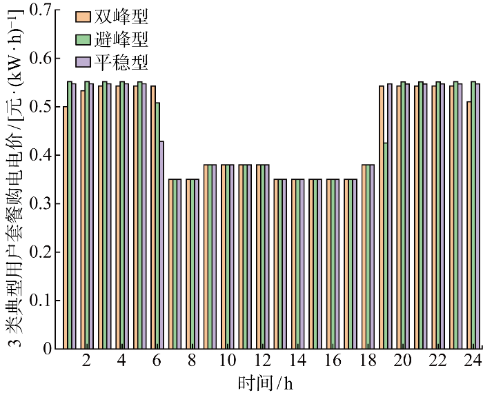 ... 本文以电网企业的售电公司为研究对象,应用K -means聚类算法对某地区600户居民产消用户负荷曲线进行聚类分析,将产消用户分为双峰型、避峰型和平稳型3种类型.其中双峰型用户有380户,避峰型用户有40户,平稳型用户有180户;3类典型用户的负荷及光伏出力预测曲线见附录图C1[16 -18 ] ;$\mathrm{\Delta }{P}_{i}^{\mathrm{p}\mathrm{v}}\left(t\right)$ 取光伏出力预测值的5%;产消用户购售电电价的平均值分别为:r b.ave =0.45元/(kW·h),r s.ave =0.21元/(kW·h);双边合同的购售电价格分别为:p zc.b =0.265元/(kW·h),p zc.s =0.248元/(kW·h)[5 ] ;现货市场购售电价见附录图C2[5 ] ;3类典型用户和售电公司储能设备的运行参数如表1 和表2 所示[19 -21 ] . ...