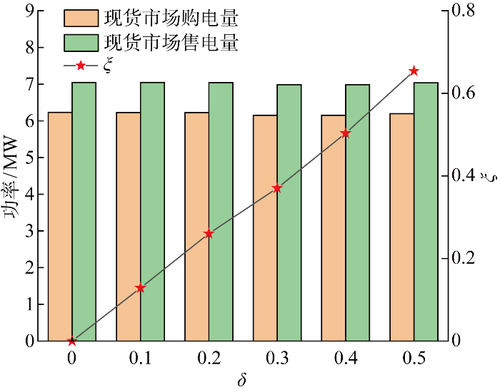 对于本文中售电公司所面临的现货市场购售电价格的不确定性,通过赋予不确定变量波动系数不同的权重,将多个不确定量归一为一个不确定量.设定现货市场购售电价格不确定变量对应的波动系数为ξ sp.b 、ξ sp.s ;对应波动系数权重为ω sp.b 、ω sp.s ,且有: