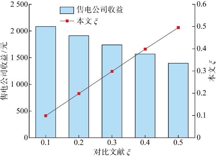 ... 在文献[11 ]鲁棒优化方法中,首先,将光伏不确定性参数Γ 设为1,给定现货市场购售电价格的不确定性区间,计算出对比文献相较于本文IGDT模型的ξ ;随后,采用鲁棒优化方法进行优化求解得出售电公司收益;最后,将售电公司收益代入本文所采用的IGDT鲁棒优化模型当中,优化得出本文ξ ,将本文ξ 与对比文献ξ 进行对比.对比结果如图7 所示,可以看出,本文ξ 与对比文献ξ 相差不大,曲线斜率近似为1,故本文所提IGDT鲁棒优化模型的有效性得证. ...