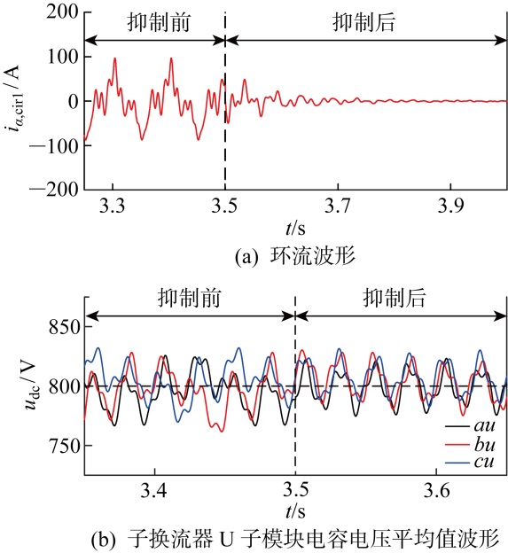 | Fig.7 Circulating current and capacitor voltage before and after circulation suppression |