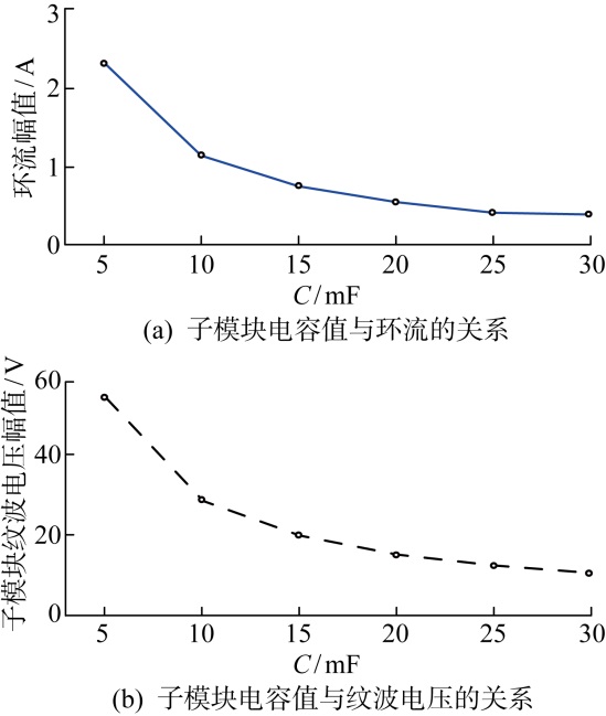 | 图9 子模块电容值与纹波电压和环流的关系 |