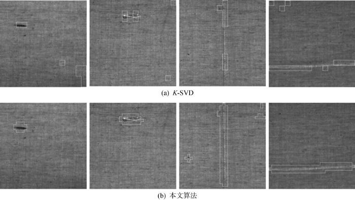 由表3中的不同算法检测时间可知,本文算法相较原K-SVD算法在每张图像的检测时间上减少了50%,这是由于本文算法只需要在训练过程中计算一次分割阈值而无需计算每张待检测图像的阈值,且字典远小于过完备字典,获取稀疏系数矩阵的时间及图像重构的时间更短,故在运行时间上优于原K-SVD算法.由表3中不同疵点的检测率可知,本文算法对于块状疵点的检测效果最好,而原 K-SVD 算法对于块状疵点的误检率更高,这是由于油污、破洞等块状疵点较小且对纹理破坏较大,进行分块置信区间阈值分割时,更容易使置信区间偏移导致误检,而本文全局阈值法则克服了该问题,检测图像中的值不影响检测阈值.由图6可知,本文算法对疵点的检测精度高于原K-SVD算法,能更加完整地选中疵点部分.