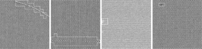 在AITEX数据集的7种织物的平均rC与rF分别为83.29%与0.78%,部分检测图像如图7所示.结果表明,将本算法用于其他简单纹理织物上检测不同种类疵点也有一定的泛用性,但由于AITEX数据集存在部分光照不均现象及部分细微疵点(较淡的油污、单根纱线的缺失)对结构相似度影响较小无法检出,导致检测效果相较于自建数据集有一定程度的降低.
