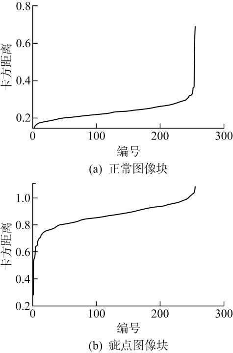 由算法1可知,其原理是利用对图像块之间相似度进行不停迭代剔除的过程,完成有疵点区域的剔除.所选择的图像块分别为正常图像块和疵点图像块进行卡方距离排序后的结果,如图1所示.由图可知,当选取疵点图像块时,整体的卡方距离较大;选取到正常块时,整体的卡方距离较小,但无论随机选取到哪种图像块,均存在一段卡方距离缓慢上升且不产生突变的区间,即图1(a)、1(b)的中间部分,此段区间对应的图像块可视为正常纹理.