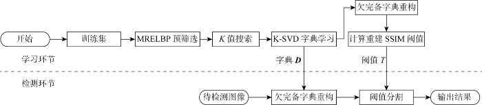 由图3可知,在学习环节中,可能带有疵点的训练集在上述筛选过程中保留了部分不带疵点的训练集,再通过K值搜索算法确定字典大小,接下来进行字典学习,并用学习到的字典来重建筛选后的训练集,计算筛选后的训练集与重构后的结构相似度.由于筛选后的训练集不带疵点,所以此时的结构相似性可作为正常图像经字典重构后的阈值,为排除误差,选择99%置信区间作为重构阈值.在检测环节,直接使用学习环节获得的字典对待检测图像进行重构并使用阈值进行分割.