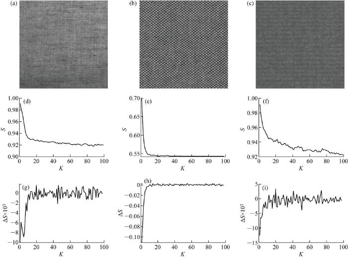 由图4(d)~4(f)可知,不同织物的邻近相似性虽波动范围不一,但变化大致趋势符合前文推论结果.根据算法2寻找一阶差分最早越过0对应的K值,由图4(g)~4(i)可知,织物图4(a)~4(c)的K值分别在13、13、17时超过0.在这些点之前,对应图4(d)~4(f)函数图像邻近相似性先迅速下降,而在此之后变得缓慢.在尽量平滑的下降趋势中找尽量小的K值,这样既可以保证主要结构能被还原,同时尽量小的K值又可以尽量降低重构时间,这一结果能证明通过算法2可以取得较优的K值.
