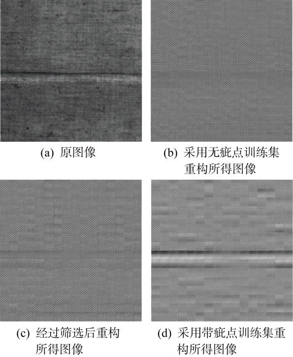 由图5可知,使用未经过疵点剔除的疵点图像经重构时,疵点部分的还原最好,如图5(d)所示.而采用无疵点图像和经过筛选后的图像进行重构时,其对疵点细节部分的还原能力较弱.根据表2中的量化数据,疵点图像为训练集时,疵点部分的MSSIM与PSNR均为最高,而整体重构的数据差距较小,证明使用疵点数据集对K-SVD算法进行图像重构会使部分疵点的还原效果提升,其原因可能是在进行欠完备字典学习时,将部分有纹理的疵点学习作为字典来还原此类面积相对较大的疵点时,会将疵点纹理还原得更好.此外,算法1筛选方法能拉大在使用疵点图像作为训练集时整体与疵点部分的差距,经筛选算法后重构图像疵点部分的MSSIM和PSNR相对于整体的差异率分别为2.9%与12.0%,高于不筛选时的1.9%与8.5%以及采用正常图像时的2.7%与10.9%,证明本算法能降低无监督训练时训练集的影响并拉大疵点部分与整体的差异,方便后续分割.