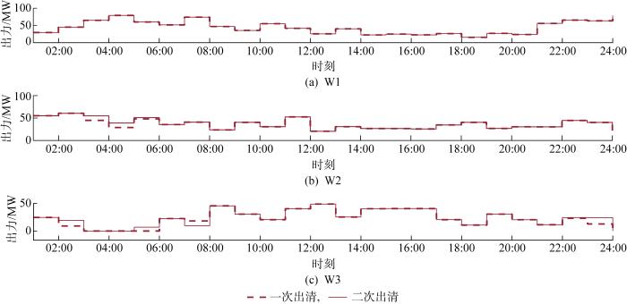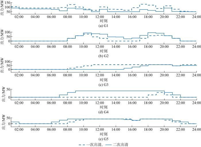 当考虑碳排放权交易后,电力市场出清结果发生改变,其中常规机组启停状态如图3 所示.可知,当二次市场出清后G3机组的连续启动时间小于一次出清,这是市场出清过程中考虑各机组最小启停时间、启停成本以及各自的碳排放量约束后,以系统总成本最小全局优化的结果.由于考虑了碳排放量约束,所提两阶段市场出清是在满足碳减排目的下的经济效益最优,所以机组的成本大小不再是影响中标的唯一因素,还需考虑各机组的减排性能.G4机组在碳排放权交易中获得了更多碳额度,因此在二次市场出清后开机时间远多于一次出清.G5机组最小启停时间为1 h,且自身碳排放强度最低,调度周期内碳额度富足,因此开机时间也多于一次出清.