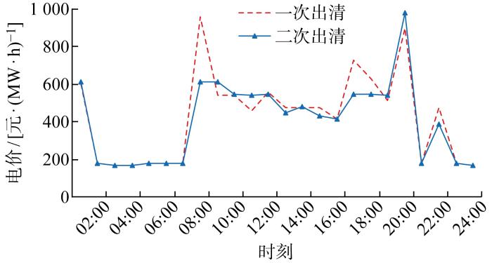 (4) 电力市场二次出清.市场交易中心确定各主体更新后的碳额度,在考虑碳额度约束下进行二次市场出清.对交易结果进行安全校核,通过校核后形成正式出清结果.