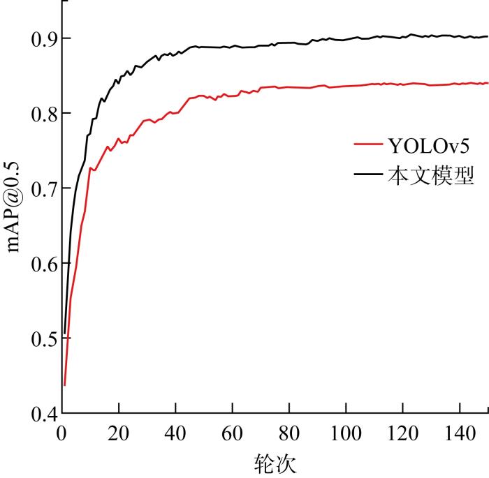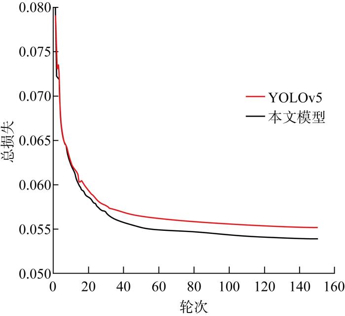 本文数据集图像大小为640像素×480像素×3,图像预处理阶段将输入图像统一缩放到640像素×640像素×3.网络模型训练时训练方法采用异步随机梯度下降法,动量大小参数取为0.937,每一批训练的批大小(batch size)为16[25].训练轮次为150轮,前100轮训练,学习率设置为0.01;后50轮训练,学习率为0.001.训练达到150轮时,精确率和损失趋近稳定,从而获得网络的训练权重.