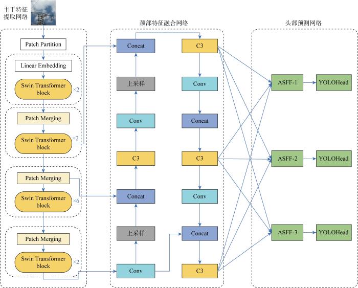 针对以上实际应用中存在的问题,本文提出一种基于窗口注意力机制与YOLOv5融合的输电线路通道异物检测算法.首先,将YOLOv5主干网络替换为窗口自注意力(Swin Transformer,S-T)网络,通过自注意力机制提升模型对复杂背景下小目标的特征提取能力,降低小目标漏检率.其次,将YOLOv5的颈部网络替换为自适应空间特征融合(adaptive spatial feature fusion,ASFF)方法,通过ASFF自适应地按照不同权重将不同层级的特征进行融合,为不同尺度目标提供更为全面和丰富的特征表示,以提高检测精度.然后,将广义交并比(GIoU)损失函数替换为对尺度和形状变化更加敏感的结构相似性交并比(SIoU)损失函数,增强目标定位准确度,进一步提升入侵目标检测精度.最后,建立包含导线异物、塔吊、烟火、防尘网4类目标的入侵异物数据集,丰富目标检测类别,覆盖多方面入侵安全隐患.