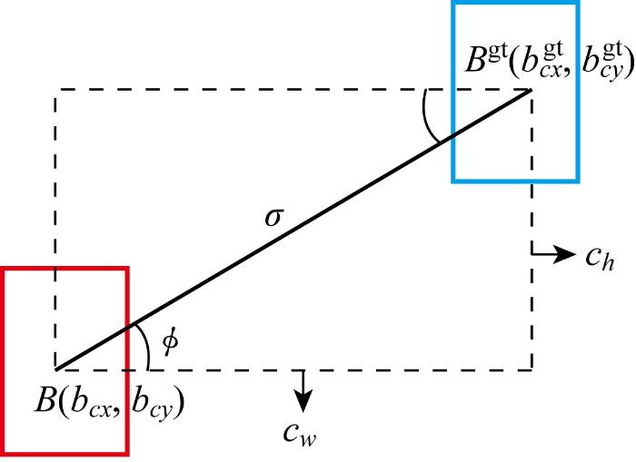 为了解决GIoU损失函数收敛慢、目标预测框定位不准确的问题,采用SIoU损失函数替换GIoU损失函数.SIoU通过优化IoU来度量预测框和真实框之间的相似度,可以有效利用相似度度量的梯度信息,更好地指导模型的训练过程,提升检测精度和定位准确度.SIoU损失函数由角度损失Λ(angle cost)、距离损失Δ (distance cost)、形状损失Ω(shape cost)和交并比损失U(intersection over union)4个损失函数组成,参数示意图如图8所示.图中:B和Bgt分别为预测框中心点及真实框中心点;cw、ch分别为点B和Bgt横坐标与纵坐标之差;ϕ为两点连线与水平线的夹角;(bcx,bcy)为预测框中心坐标;(