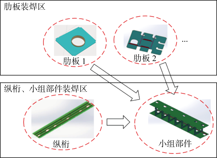 装焊作业开始的前提条件是:场地和工人资源有空余、前序工序均已完成、所需物料已送达.小组立装焊过程涉及到装焊工人和打磨工人两个工种,当前时刻计划工人配置总数不能超过相应工种的工人总数;场地资源也是小组立装焊调度过程中的关键要素,通常为一矩形空间,按照工艺不同可分为肋板、纵桁以及小组部件装焊场地,其中纵桁装焊完成后不需要释放场地资源,等待需要的肋板装焊完成后运送至该场地进行组合装焊作业,构成小组部件,如图1所示.小组立占用的场地资源描述为其部件主板形成的包络凸多边形面积.