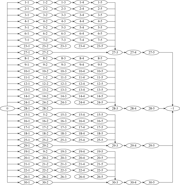 第1条染色体为小组立任务组号排列,各个小组立在装焊过程中需要按顺序放置在对应装焊场地中,并且占据一定的工人资源和场地资源,小组立任务组号染色体形式为