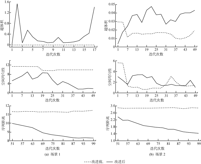 本文改进的NSGA-III算法在场景1下所获得的HV指标和Spacing指标均优于原始NSGA-III算法,在场景2的大部分迭代过程中,HV指标和Spacing指标优于原始的NSGA-III算法,说明了本文对NSGA-III算法的改进能够提升解的多样性和均匀性.另外,改进的NSGA-III算法在迭代前期倾向于获得多样性更好、更均匀的种群,以更好地探索解空间,在迭代后期,采用基于R2指标的方法,加速算法收敛,并且趋向于获得与原始计划距离更近的方案.