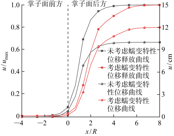 将考虑与未考虑蠕变特性的位移曲线和位移释放系数曲线绘制于图1. 图中:R 表示隧道开挖半径.在纵向变形曲线中,考虑蠕变特性的黏弹性解答达到最大变形的位置晚于未考虑蠕变特性的弹性解答;而考虑蠕变特性的最大变形大于未考虑蠕变特性,因此在针对软岩隧道设计时必须考虑蠕变特性的作用.而本文将由于蠕变特性导致围岩变形收敛时间显著增长的情况称为围岩的时间效应;将不同位置围岩变形不同的情况则称为围岩的空间效应.