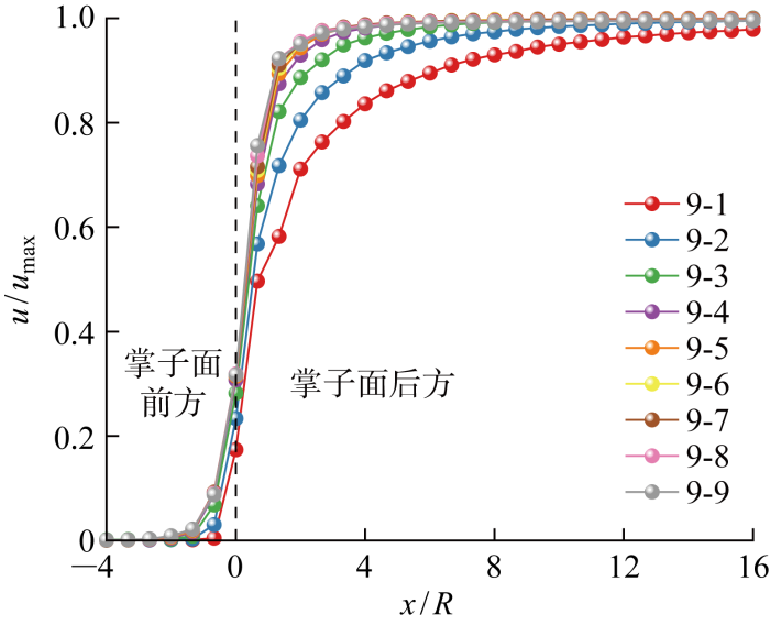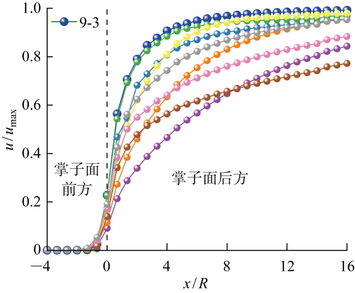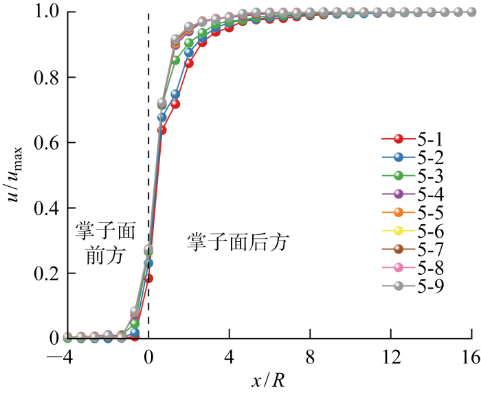 当延滞时间较小时(系列1~6最大延滞时间为470 s),在掌子面前方即x/R <0,位移释放的时空效应均从2倍隧道半径内才开始出现.以系列5为例,不同速度对应的位移释放系数曲线绘制于图9. 当速度为16和8 m/d时,位移释放系数随着开挖速度的减小而增大;当开挖速度小于或等于2 m/d时,开挖速度对位移释放系数变化基本没有影响;开挖速度为4 m/d的工况介于上述情况之间.