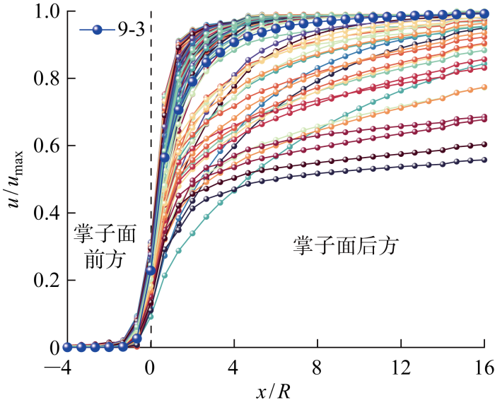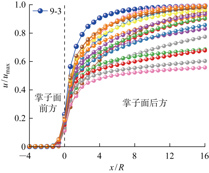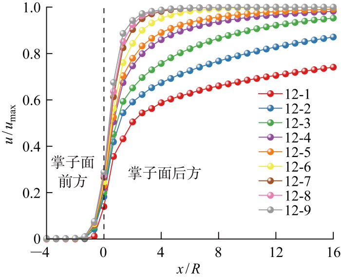 高延滞时间工况(系列10~14,以系列12为例)的位移释放系数曲线如图11 所示,曲线在掌子面前方的起点相较于低延滞时间系列距离掌子面更远.而在掌子面后方,围岩变形的持续时间将随着延滞时间的增加而逐渐增加,因此在数值模拟的模型范围内越来越难以达到最大收敛位移.因而在系列12中,12-1、12-2和12-3这3条曲线在16倍隧道半径的范围内无法形成完整的S形曲线.