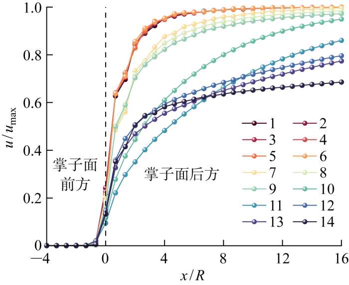 为探究不同延滞时间下位移释放系数曲线的差异,将开挖速度为16 m/d的各系列位移释放系数曲线绘制于图12. 系列1~6均形成了完整的S形曲线,且各曲线差别较小;系列7~9逐渐开始无法形成完整的S形曲线,但仍在逐渐接近于1,因此基本可认为形成了完整的S形曲线;系列10~14在16倍隧道半径的范围内均无法形成完整的S形曲线,且随着延滞时间的增加,位移释放系数增长越缓慢,围岩更难达到平衡.