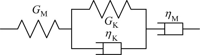 为通过数值模拟归纳总结得到考虑时空效应的围岩释放系数的经验公式,本文采用Burgers本构模型展开研究,如图2 所示,并做出以下假定:① 围岩各向同性且具有稳定蠕变特性;② 隧道为深埋圆形隧道,且模型不考虑重力作用;③ 围岩为均质黏弹性材料,变形满足小变形假设.图中:G K 表示Kelvin切变模量;η K 表示Kelvin黏滞系数;G M 表示Maxwell切变模量;η M 表示Maxwell黏滞系数.