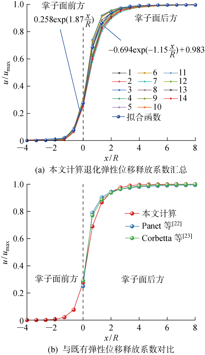 ... 在传统的弹性力学中,围岩变形仅需考虑其空间特征.当开挖速度较小时,时间效应可被忽略,本文中的黏弹性围岩位移释放系数解答可退化为弹性解,如图20 所示.取开挖速度为0.2 m/d,将本文计算结果绘制于图20(a) ,不同围岩参数具有一致的空间效应,可用统一的函数分别对掌子面前方和后方的位移释放曲线进行拟合.将计算结果与其他学者[22 -23 ] 所提出的位移释放系数计算方法进行对比,对比情况如图20(b) 所示.本文中黏弹性围岩位移释放系数解答退化后的弹性解与其他学者所提出的弹性结果重合度较高,表明了本文拟合函数的可靠性.然而既有公式均未考虑时间效应,与黏弹性洞周位移规律有较大偏差.因此,本文所确定的位移释放系数可更好地反映黏弹性洞周位移规律,保证隧道支护设计的安全性和科学性. ...