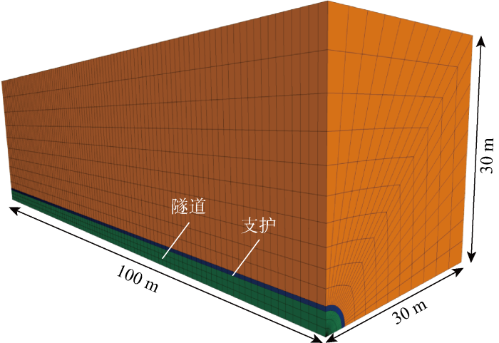 由于不考虑重力作用,模型(见图3 )可以选取1/4进行模拟分析.现有理论认为空间效应只存在于10倍隧道半径以内[15 ] ,因此选择隧道的开挖半径为3 m,模型的水平和和竖直方向均为10倍洞径(30 m),纵向长度为100 m.根据隧道的实际情况,模型上方以外的边界均设置为固定边界,地应力可按照相应的梯度施加在模型节点上.