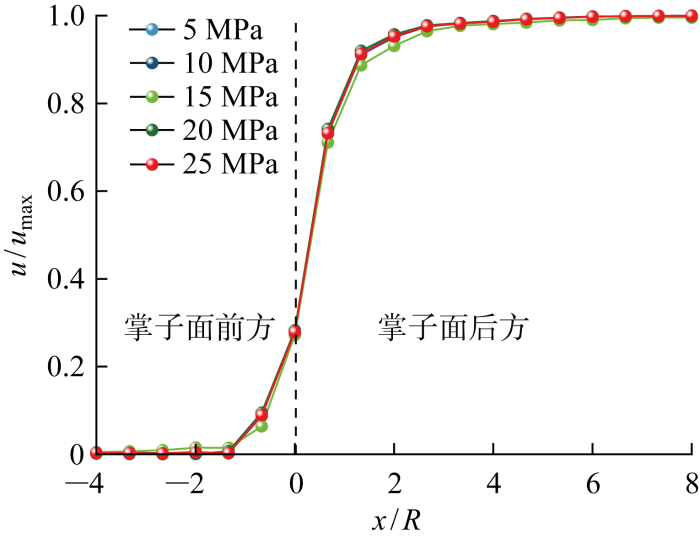 为探究地应力对围岩纵向变形曲线的影响,选取5个地应力梯度5、10、15、20、25 MPa 开展研究,将各组拟合结果绘制于图4. 在各系列中,不同初始地应力的位移释放系数曲线基本相同,因此地应力对位移释放系数的影响基本可忽略不计.